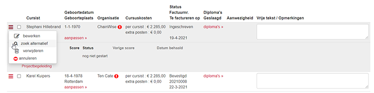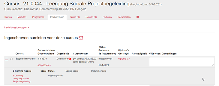 Los van het verplaatsen van cursussen hebben veel opleiders te maken met verplaatsing van cursisten/inschrijvingen. De cursist moet uitgeschreven worden van de cursus, waarvoor eventueel een creditnota gemaakt moet worden. Vervolgens moet er op zoek gegaan worden naar andere data waarop dezelfde cursus gegeven wordt. Hierop zal de nieuwe inschrijving gedaan moeten worden.