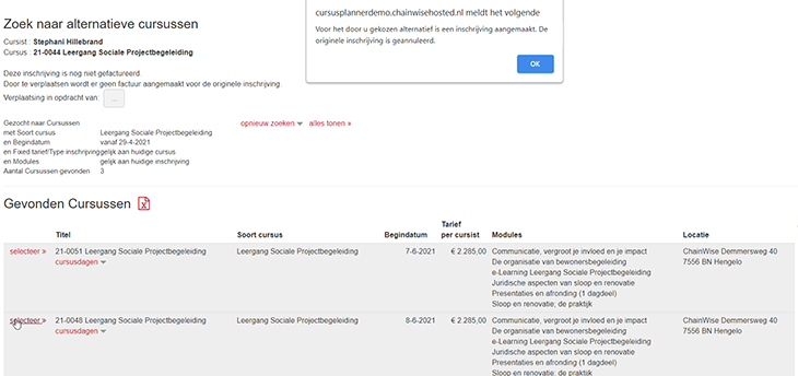 De module houdt bij verplaatsen ook rekening met e-learnings die via de LTI koppeling lopen en de trajectenmodule. Cursisten krijgen bij verplaatsing in klantportaal e-mails over de verplaatsing. Ook krijgt de interne contactpersoon van de cursus hiervan een mail.