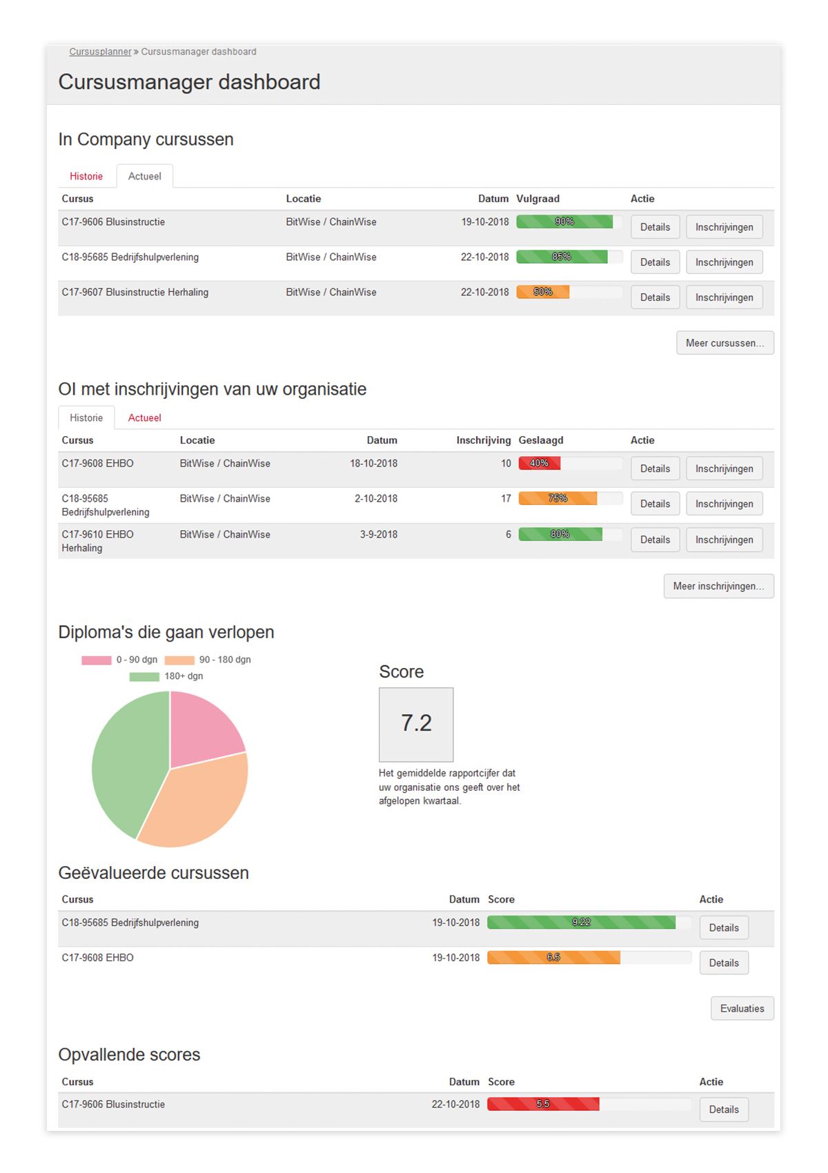 Welke inhoudelijke versie van het dashboard wordt getoond is afhankelijk van de rechten die de gebruiker heeft. Door optimaal overzicht kan snel worden doorgeklikt naar iedere gewenste Cursusplanner functionaliteit.